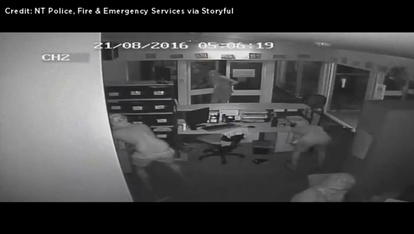 Security footage released by Northern Territory Police show the four suspects, whose heads were covered with what appeared to be their own shirts, forcing a hole through the window of the office at the Taminmin College in Humpty Doo, near Darwin.