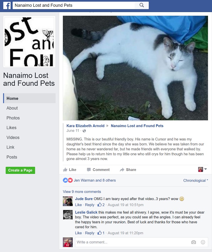 “I’ve been posting on the Nanaimo Lost and Found Pets page and all sorts of things for the past three years because Claudia’s been really sad since he’s gone,” Kara told Global News.