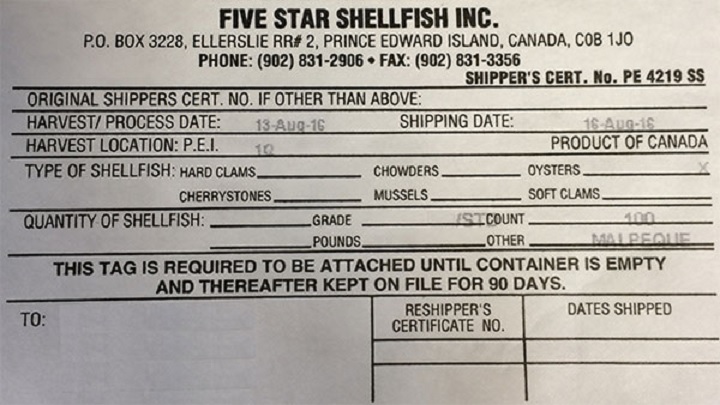 The oysters, packaged as “Large Standard Oysters” and “Mixed Oysters,” are produced by P.E.I.-based Five Star Shellfish.
