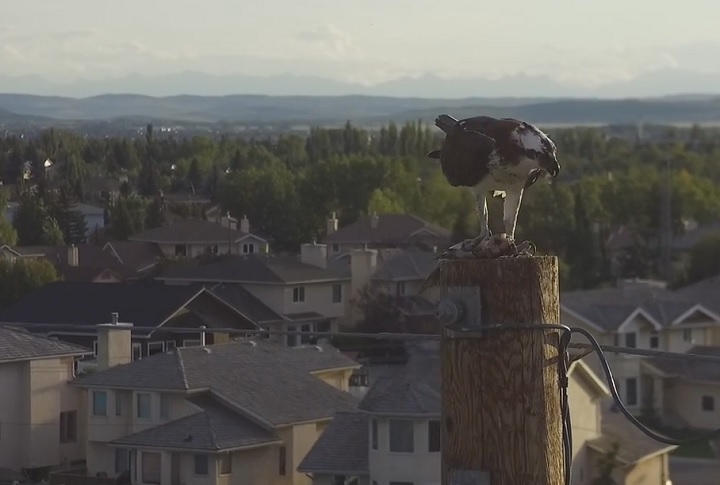 A Calgary home inspector has captured a bird’s eye perspective of an osprey eating a fish dinner on top of a power pole next to Deerfoot Trail.