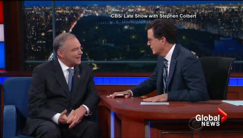 During an interview with late night host Stephen Colbert Thursday night, U.S. Democratic Vice Presidential candidate Tim Kaine shifted not just topic, but languages to launch an attack on Republican nominee Donald Trump.