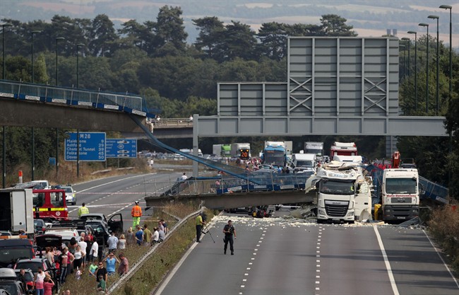 Witnesses say a truck hauling construction vehicles appeared to clip the bridge Saturday on the London-bound M20 highway 30 miles (48 kilometres) southeast of the British capital.