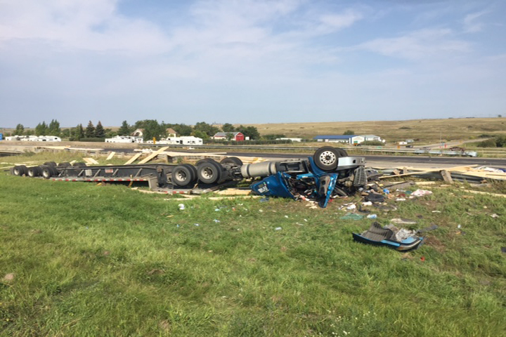 RCMP were called to the intersection of Highway 1 and Highway 39, which is four kilometers east of Moose Jaw, Sask. There, officers found a semi truck rolled over and lost its load, police said.
