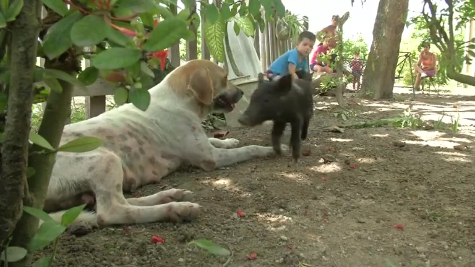 “The (mother) pig died but had already given birth so I collected the piglets. Here at home, a dog had already given birth and I came up with the idea of putting them together to see if the dog would accept them. On the first day she was a little hesitant, but ended up giving them (milk) and then a week on, she would arrive on her own volition to feed the piglets,” said owner of the animals, Ignacio Estevez.