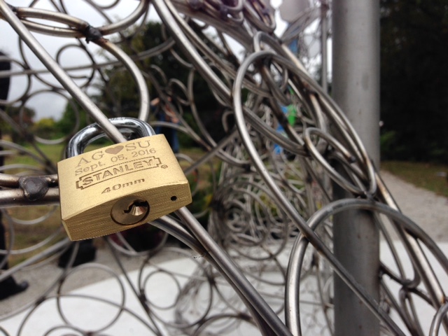 Names, initials or romantic messages are typically inscribed on the padlock and the key is thrown away to symbolize an unbreakable bond.
