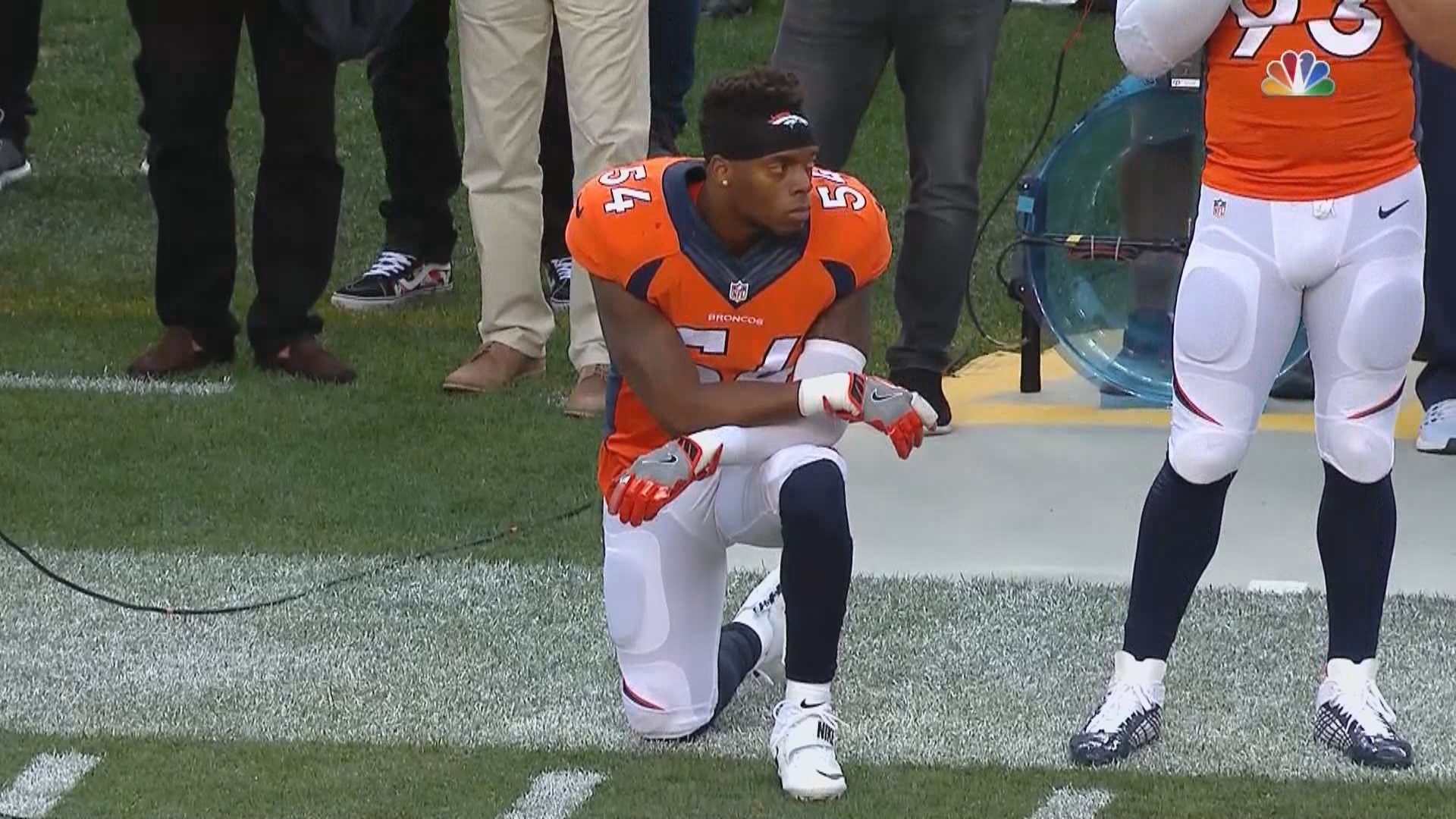 Prior to Thursday’s game, Marshall made no mention of his plans, but shortly after the large American flag was unfurled, the fifth-year linebacker out of Nevada went to the end of a long row of Broncos and went down on one knee.