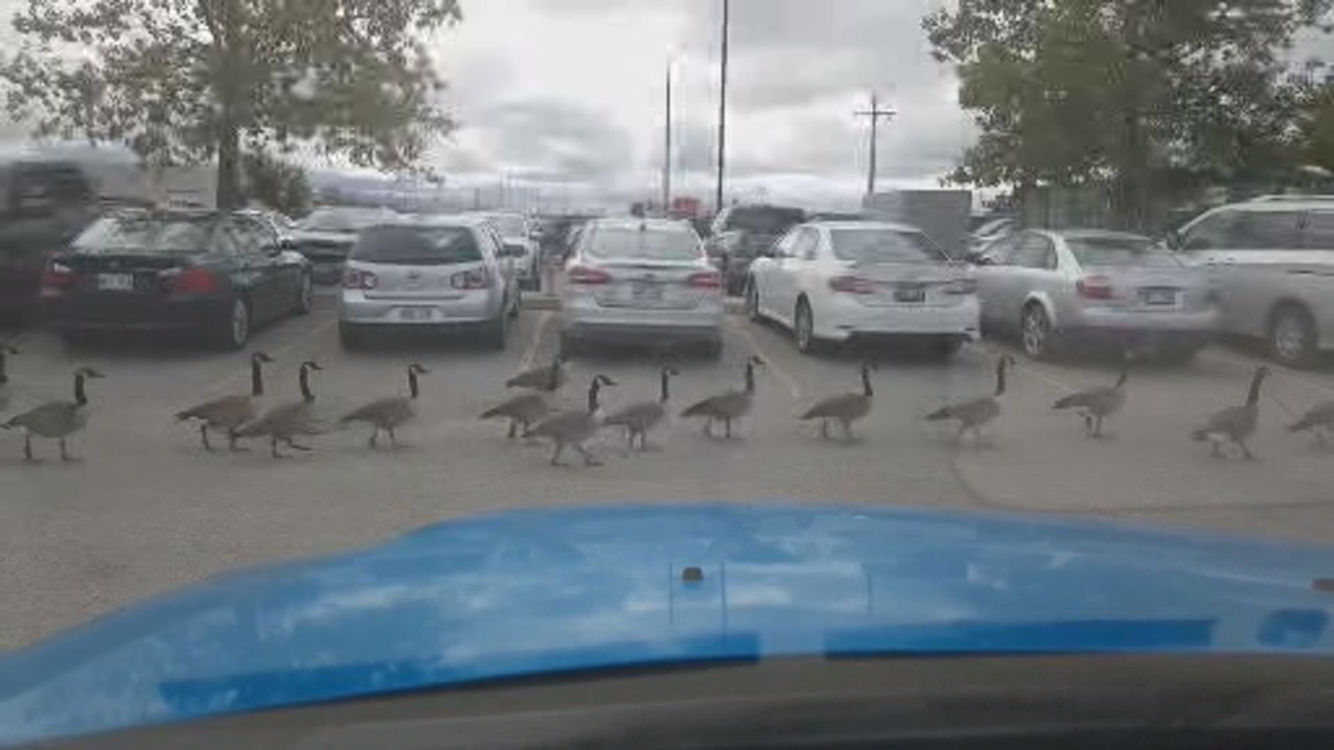 Blair Malazdrewich, who works at Shaw Communications on Scurfield Boulevard, said he was leaving work Tuesday when dozens of geese started walking in front of his car.