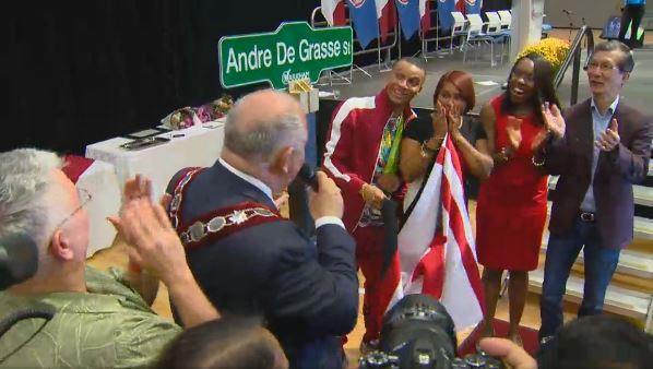 In front of an excited hometown crowd, Markham, Ont. native Andre De Grasse helped unveil a sign that will mark a local street to be named after the Olympic sprinter.