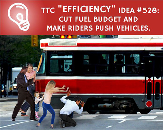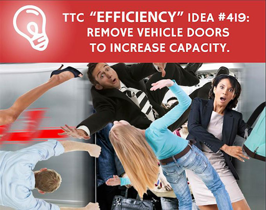 These are just a couple of the “efficiency” suggestions raised during a new tongue-and-cheek campaign called “So Efficient It Hurts” by transit advocacy group TTCriders.