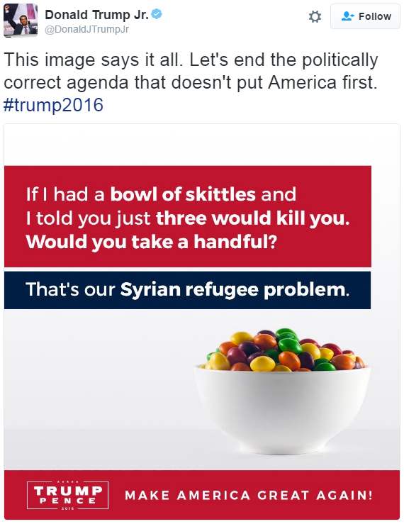 Donald Trump Jr. has been left with rainbow coloured egg on his face after a controversial tweet comparing Syrian refugees to a bowl of poisoned Skittles.