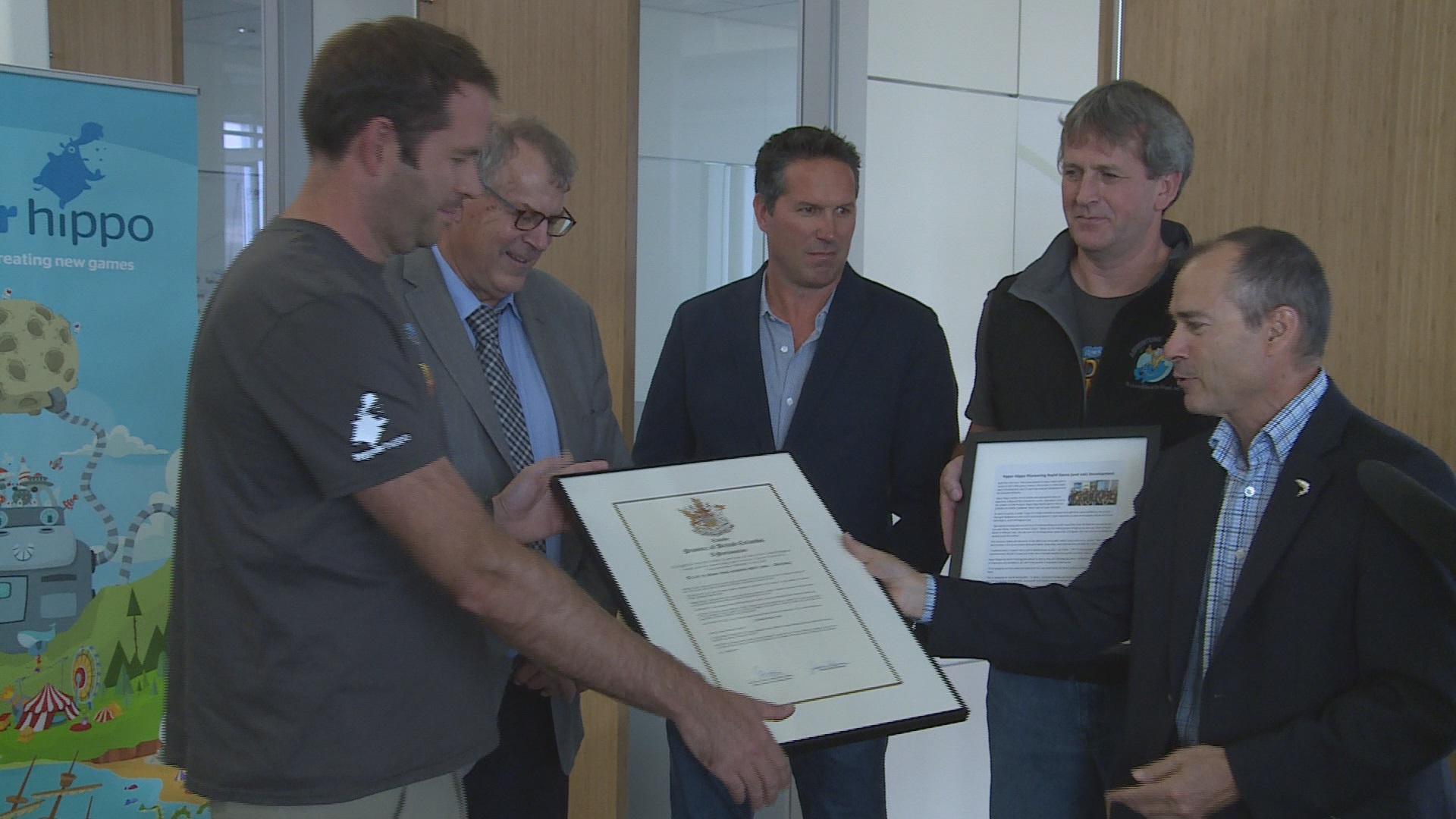 Kelowna MLAs Norm Letnick and Steve Thomson presented Hyper Hippo CEO Lance Priebe with an honour for his company’s accomplishments as well as a framed copy of the government’s official proclamation declaring Sept. 21 ‘Screen Day in B.C’.