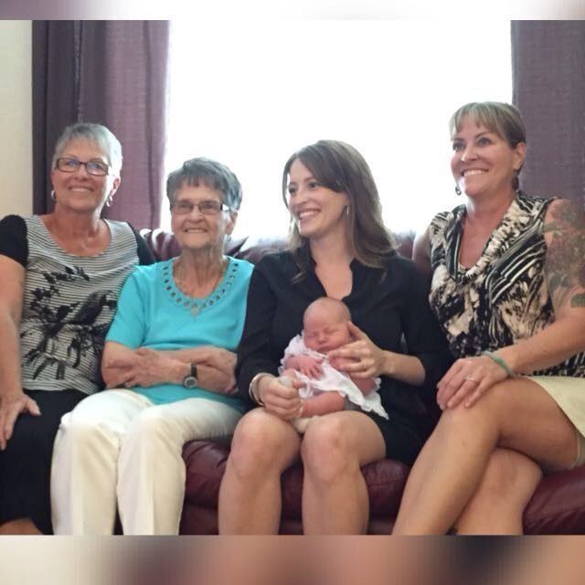 Danielle’s mother Shauna has the sweet spot: right in the middle of the multi-generation family. She became a grandma while her own grandmother is still living.