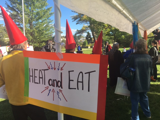 Many protesters, some dressed as gnomes, called on Hydro One to stop issuing disconnection notices to customers who’ve fallen behind in their bills.