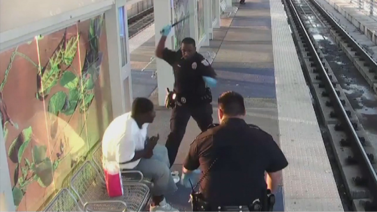 HOUSTON – A Houston transit police officer has resigned after the release of a surveillance video that shows him beating a man he found slumped on a seat on a rail platform.