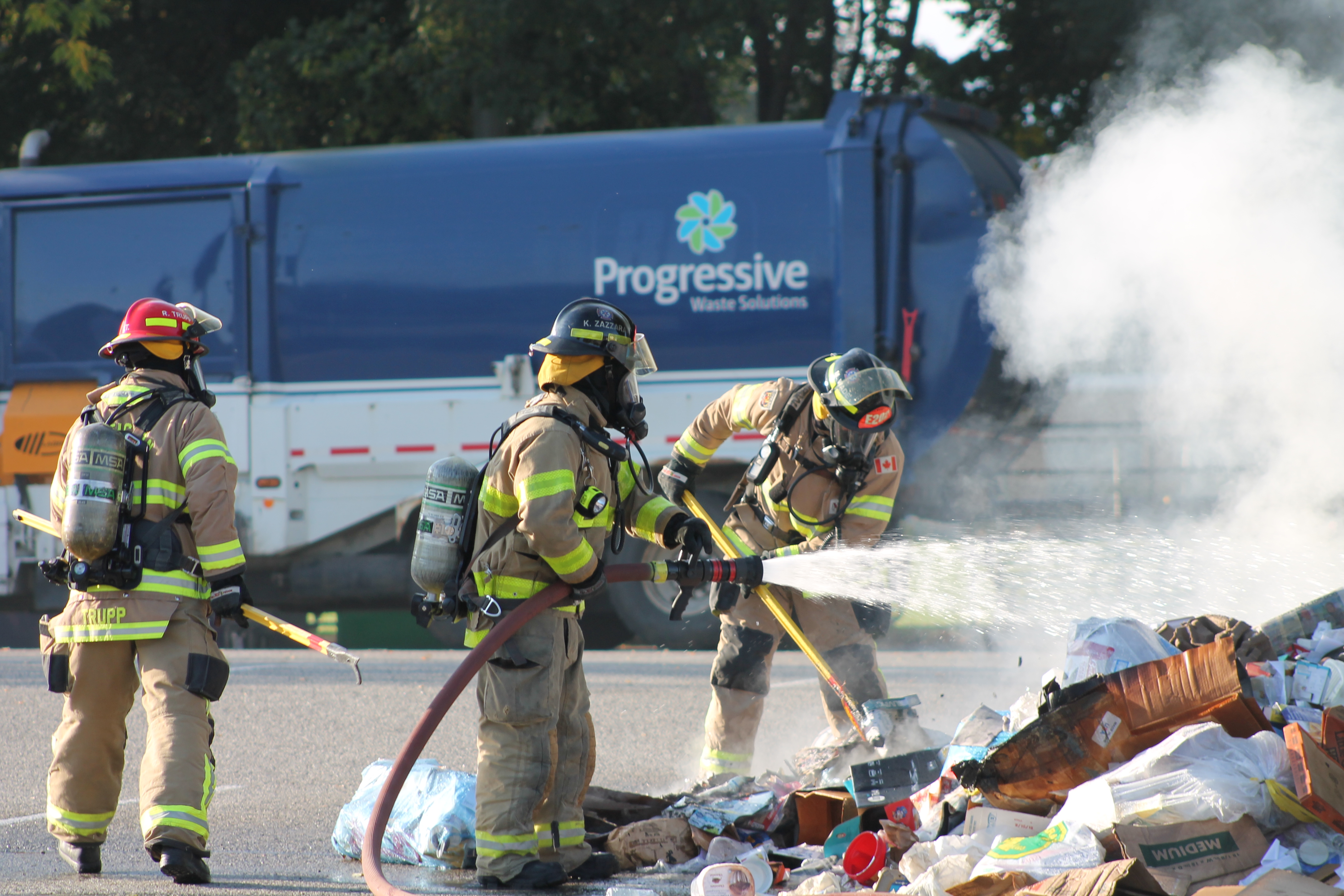 The fire started inside a waste removal truck and when the driver noticed the small blaze, and as per company protocol, he found a nearby clear area where it was safe to dump the trash.