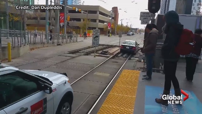 WATCH ABOVE: Dan Duplessis captured this footage of a car driving on the CTrain tracks on 7th Avenue near the City Hall Station Monday – Oct 3, 2016