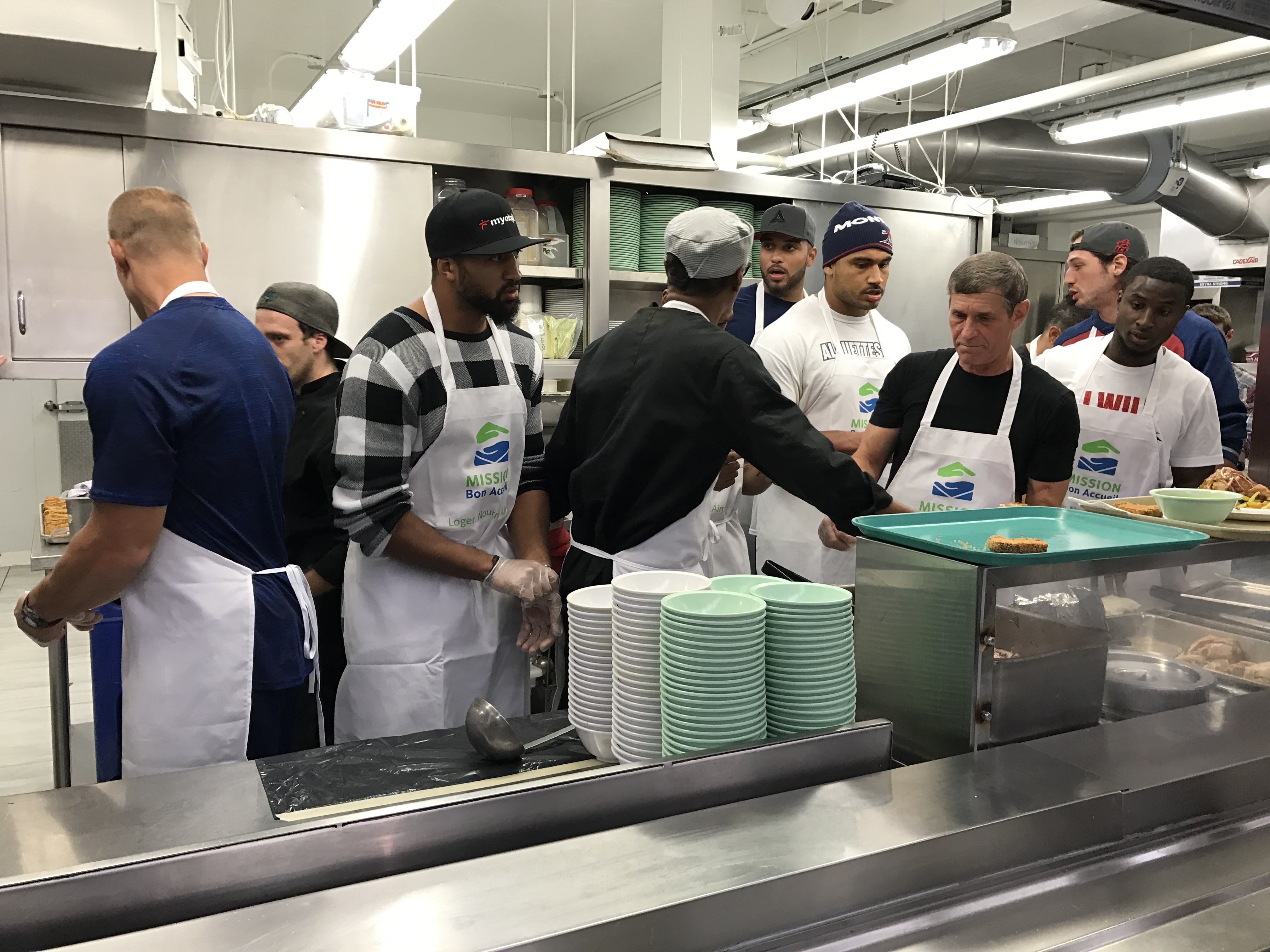 Players from the Montreal Alouettes stopped by the Welcome Hall Mission to help lift some spirits.