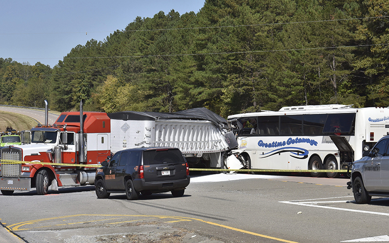 Gilmer County fire spokesman Tony Pritchett tells the Atlanta Journal-Constitution that the charter bus ran into the side of a tractor-trailer.