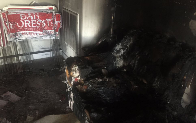 On Sunday afternoon, the walls of the multi-room office were covered in black char, and a couch against one wall had been burned down to its springs. Shattered glass covered the floor, and melted campaign yard signs showed warped lettering.