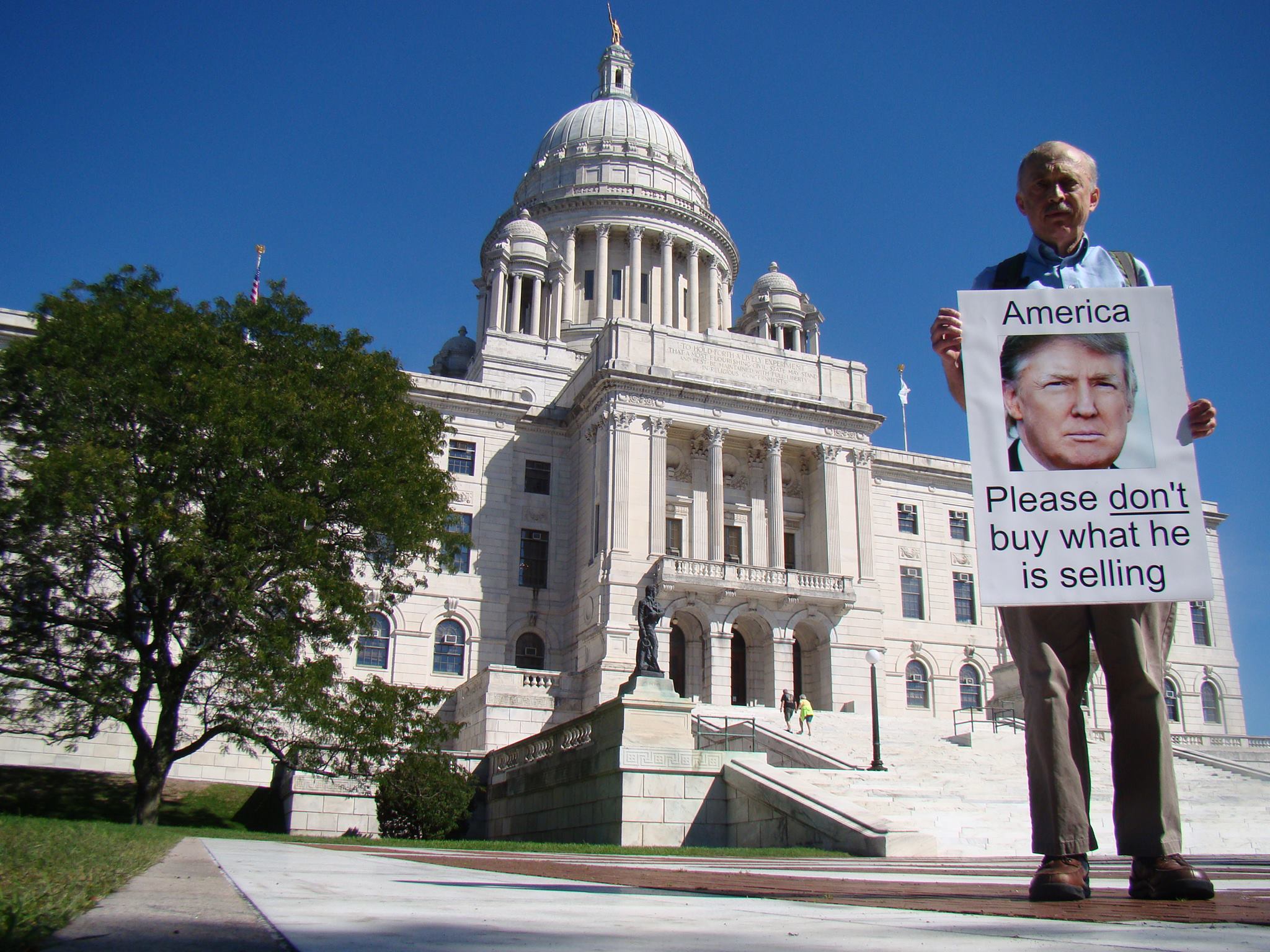 Adler is carrying out his mission armed with just a sign featuring a photo of Donald Trump and a quote: “For our country’s sake, don’t hire this man.”