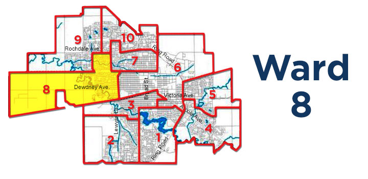 Ward 8 is located in west-central Regina bordered by Lewvan Drive on the east and west to the city limits.