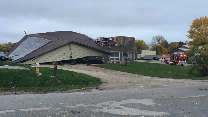 Besides downed trees and hydro lines, the roof was torn off a Mister Transmission shop in Collingwood, Ont.