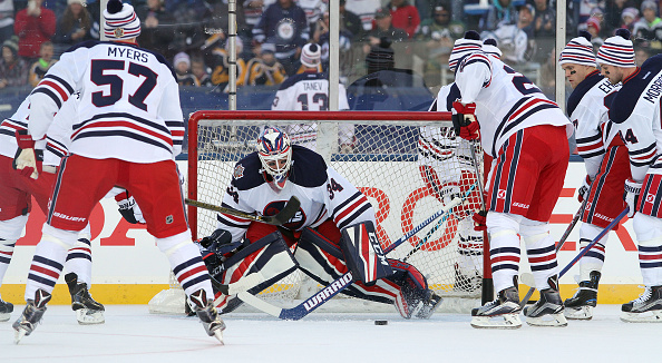 The start of the game was delayed by almost two hours due to sun glare. The NHL says player safety would be in jeopardy if an outdoor game is played with intermittent sunlight. There were still a few sun spots on the ice when the puck eventually dropped at 3:53 p.m. CT.