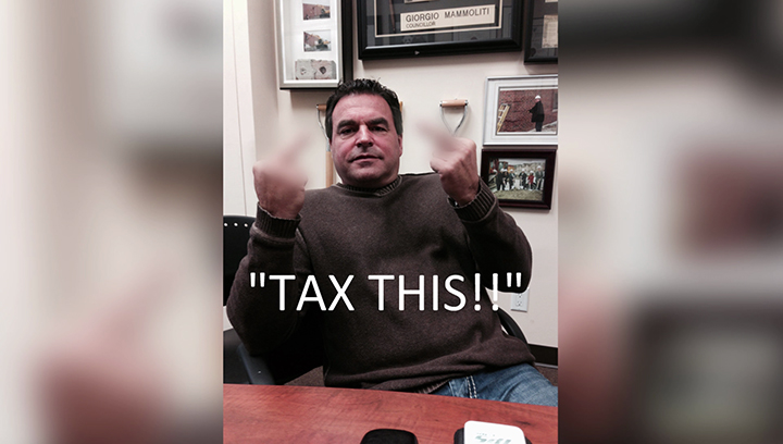 Toronto City Councillor Giorgio Mammoliti sent out a photo of himself giving the middle finger in response to a city hall proposal that he says seeks to raise taxes for residents with roofs on their properties.