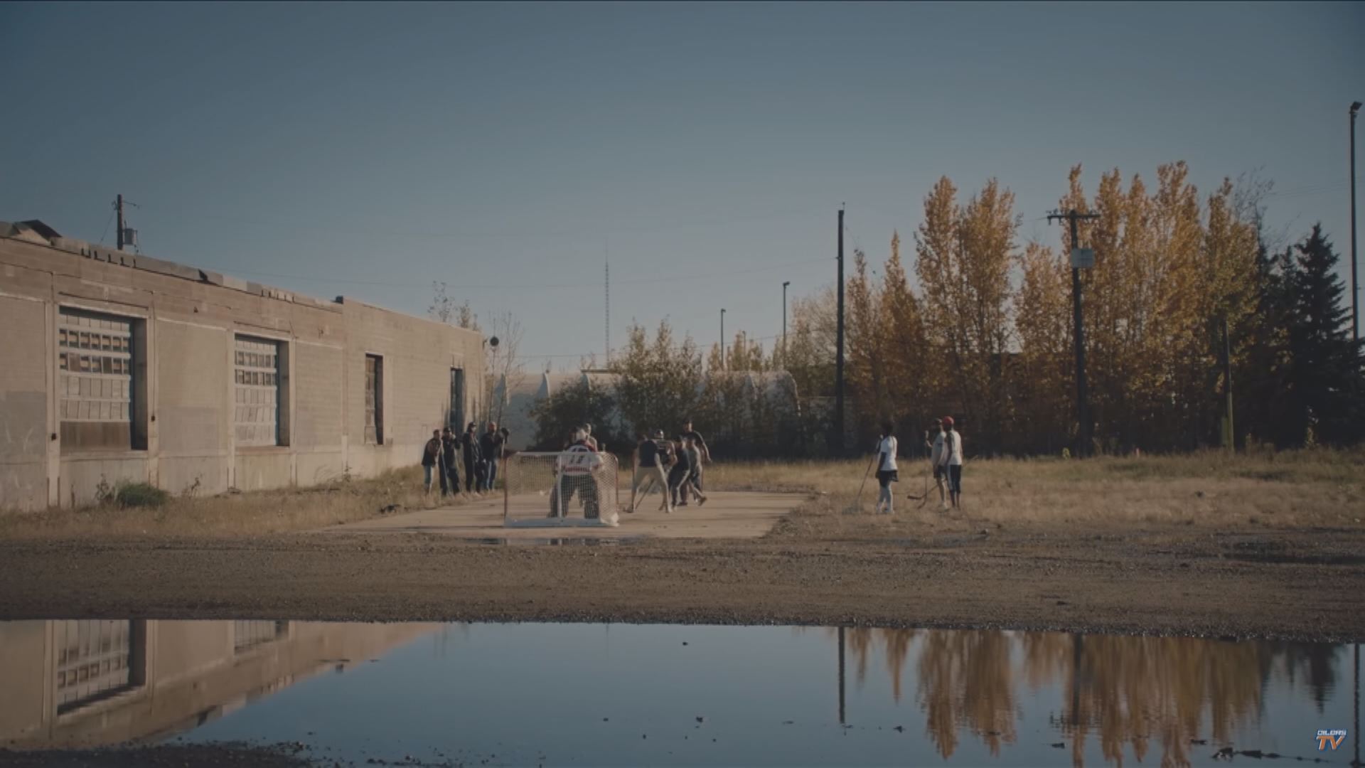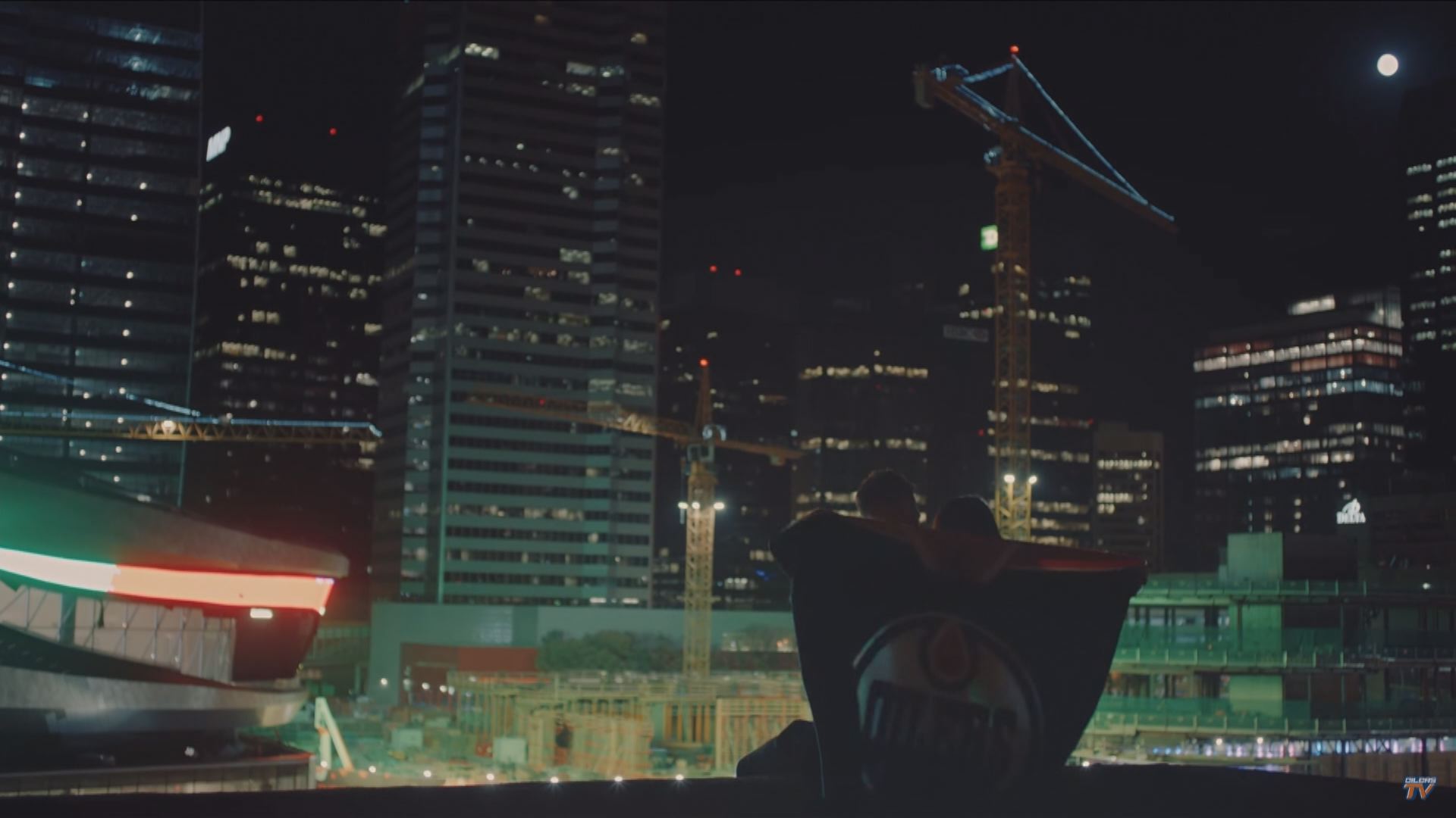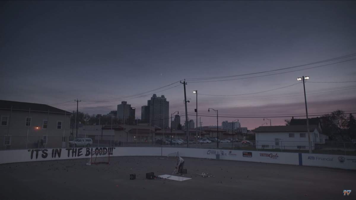 Yes, the video includes game highlights and shots from the new Rogers Place arena. It also features community hockey rinks, train tracks, a refinery, the High Level Bridge and a ball hockey game on Enoch Cree First Nation.