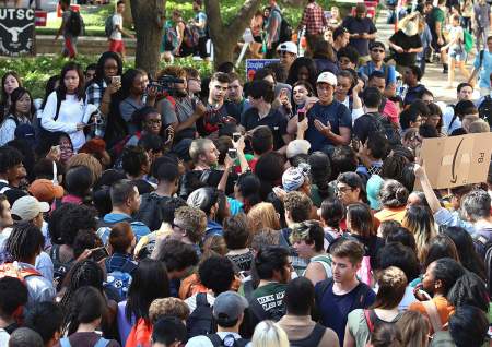 The Daily Texan, the independent campus newspaper, reported that protesters began to gather about an hour later to debate with the sale participants. Protesters chanted, “Racists go home!”