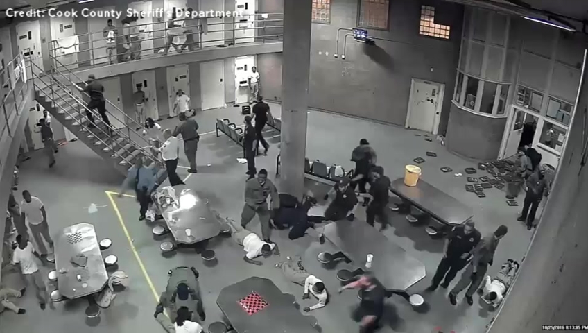 Security cameras at the Cook County Jail near Chicago, Illinois captured a massive brawl Tuesday night, involving dozens of inmates and guards as well as a variety of weapons.
