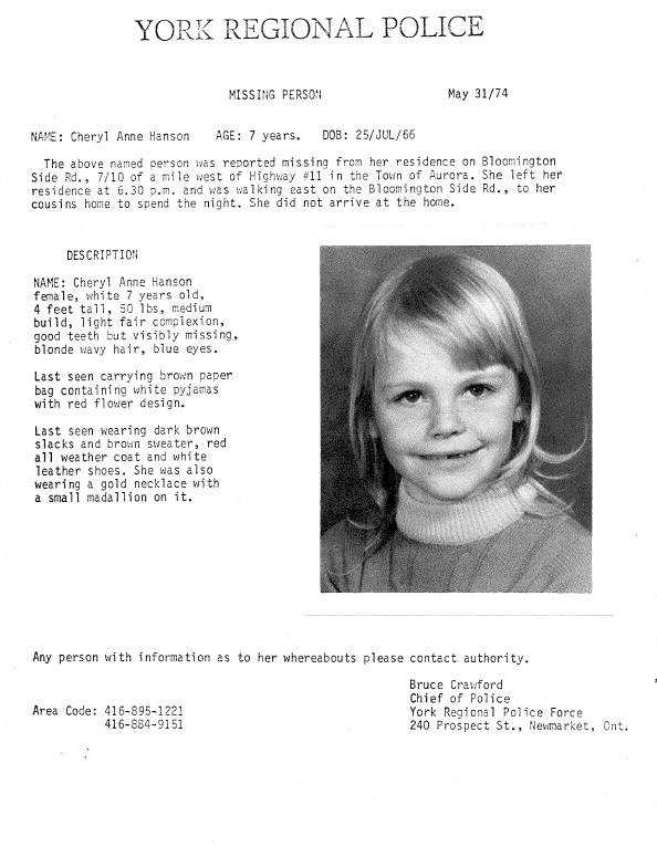 York Regional Police took on the investigation and witnesses came forward saying the saw Cheryl walking along Bloomington Road in Aurora, Ont.