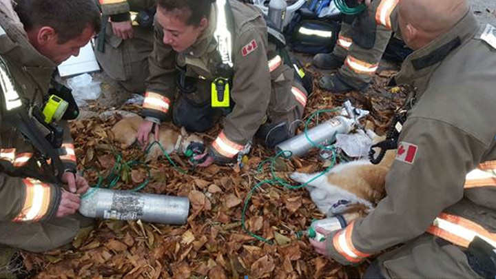 Oxygen was used to revive the four dogs, however the cat and the parrot did not survive.