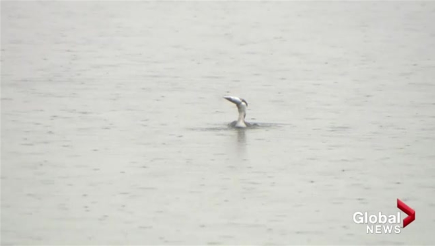 Global Okanagan cameraman Jim Lenton captured a Merganser on Killiney Beach on the north westside of Okanagan Lake having a hard time eating a big fish.