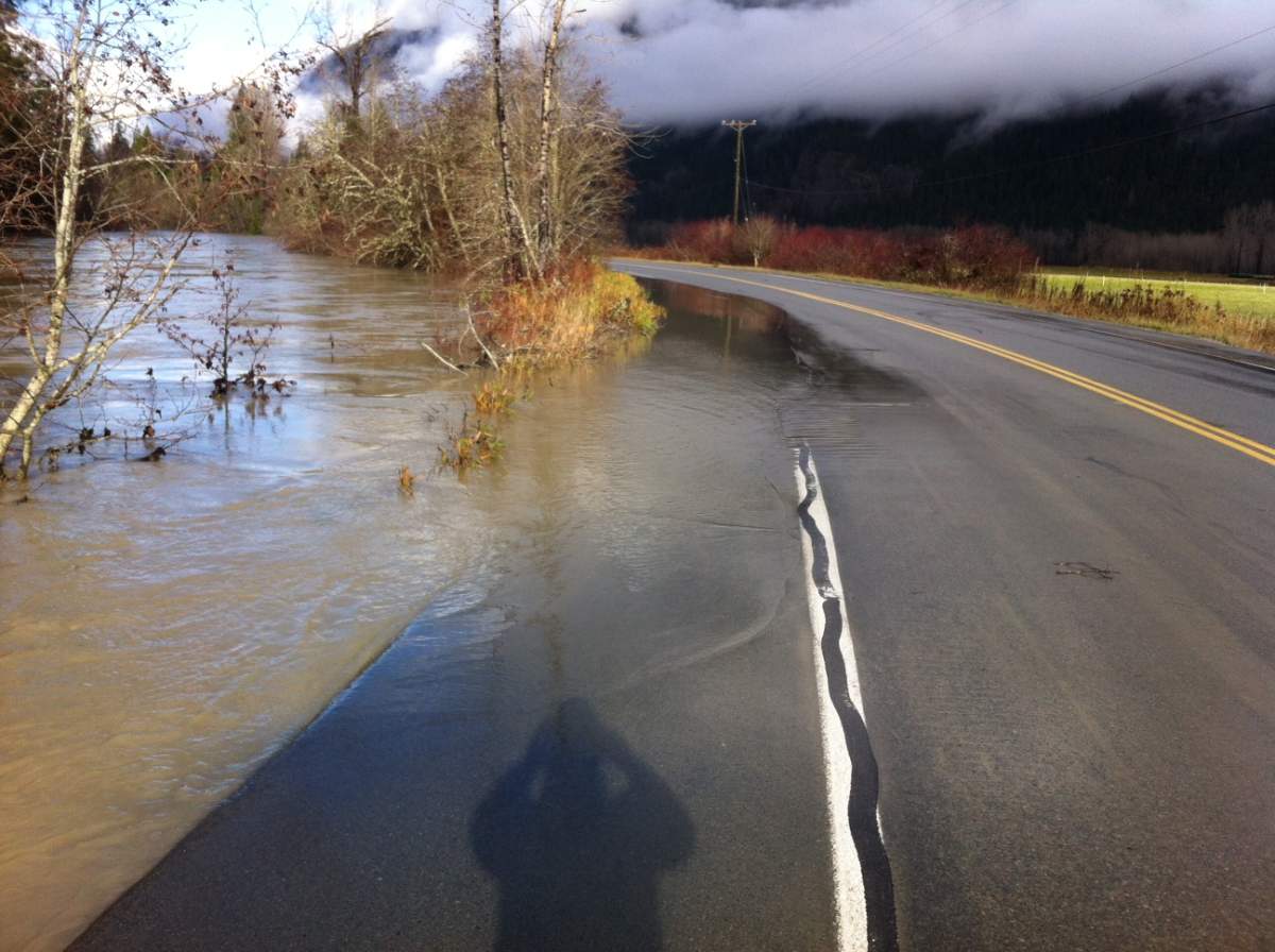 The flooding has shut down Pemberton Meadows Road near kilometer 23. Crews are on scene and hope to have the road open to single-lane alternating traffic by Thursday night.