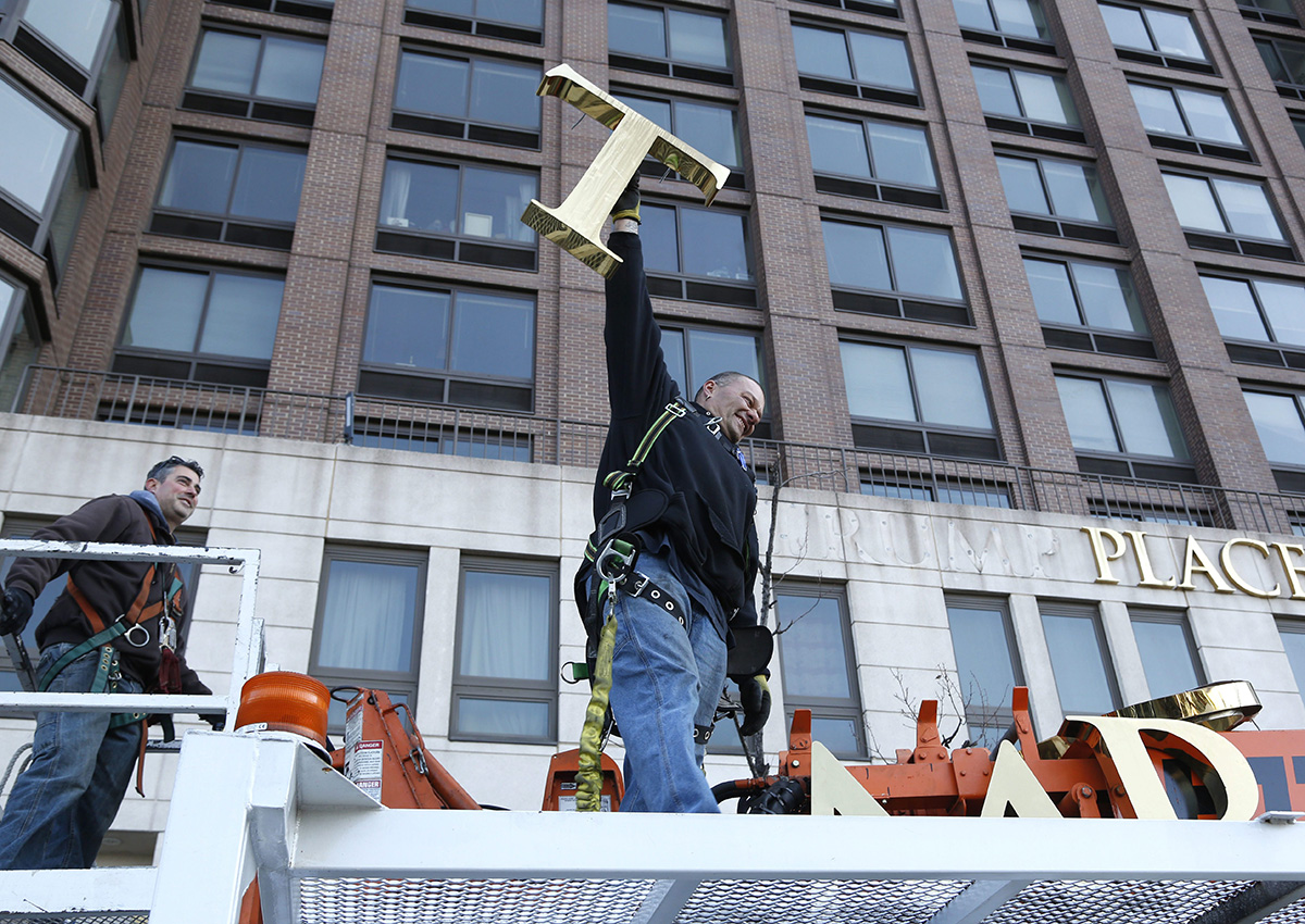 Workers pried 3-foot-high gold letters spelling “Trump Place” off the buildings Wednesday.