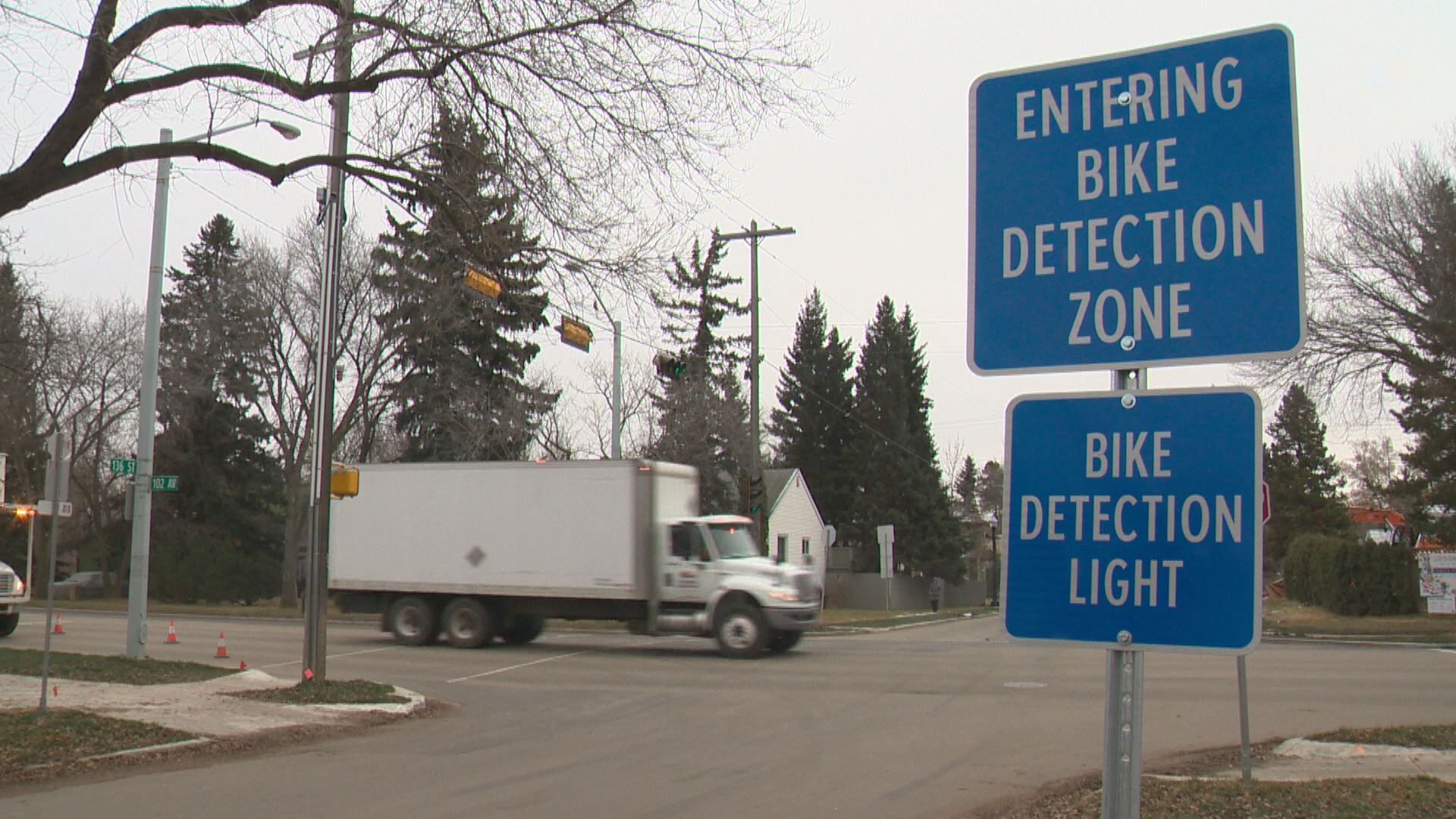 Bicycles approaching the busy intersection will trigger a magnetic sensor under the pavement which then changes the lights on 102 Avenue, allowing the cyclist to cross.