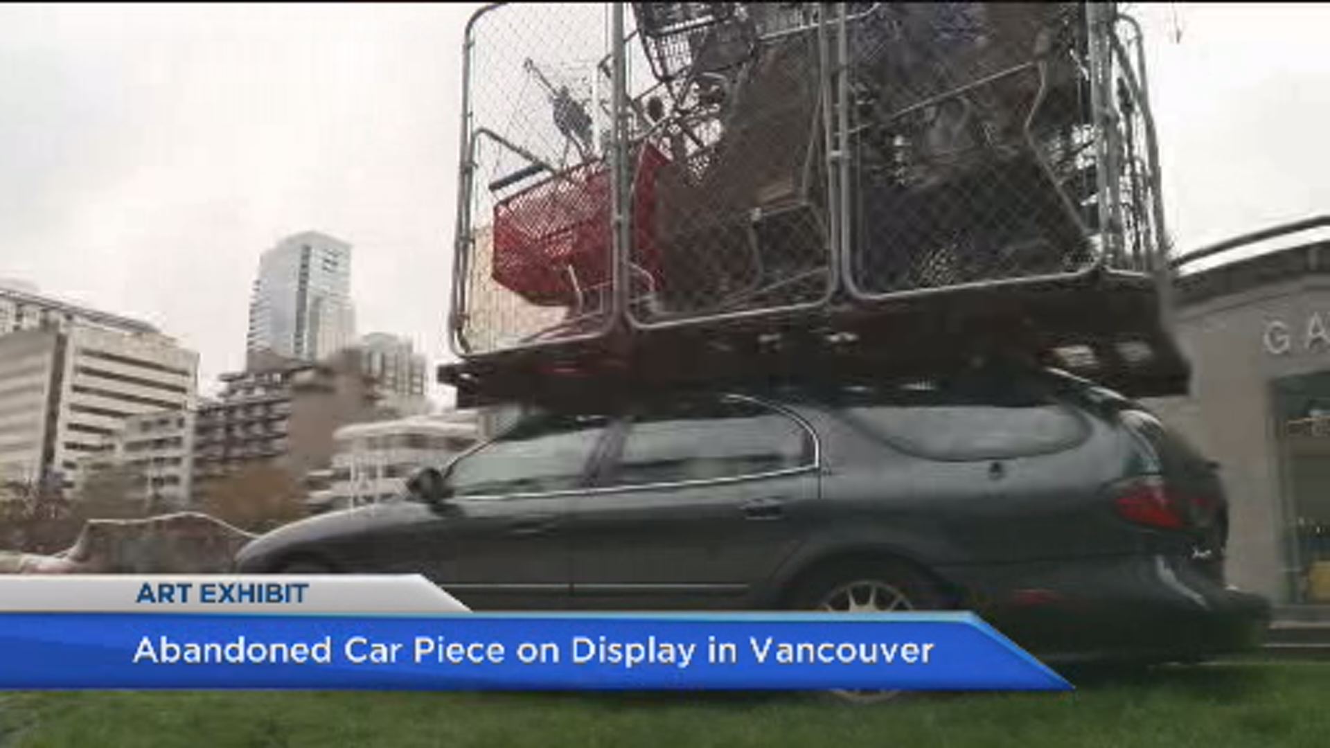 Outside the Vancouver Art Gallery, at the corner of Howe and Georgia Streets, is an abandoned car with a cage filled with shopping carts on the top.