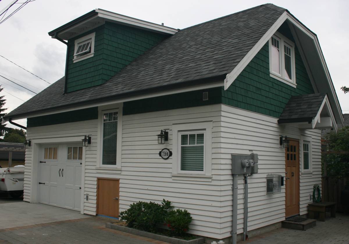 The 843-square-foot craftsman style coach house is five years old has two bedrooms, a full bathroom, living room, kitchen, and garage.