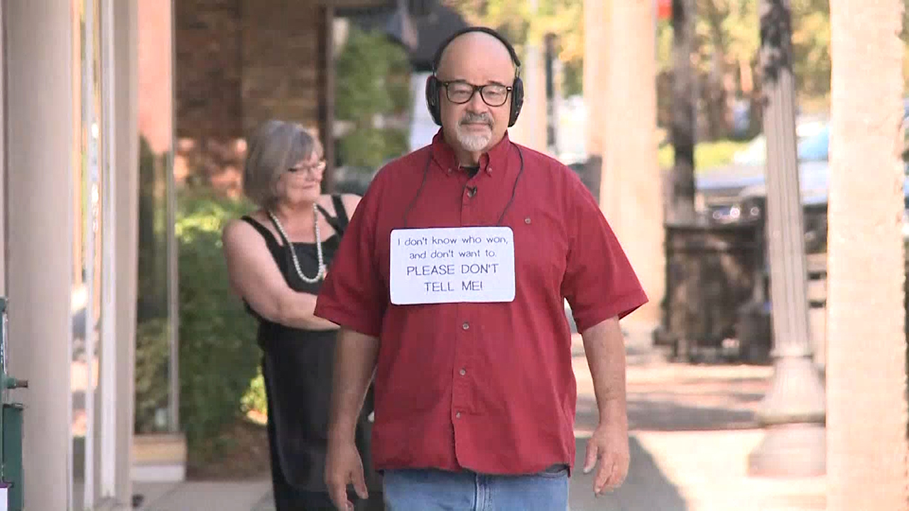 He even fashioned a sign to wear around his neck, which read: “I don’t know who won and don’t want to. Please don’t tell me!”