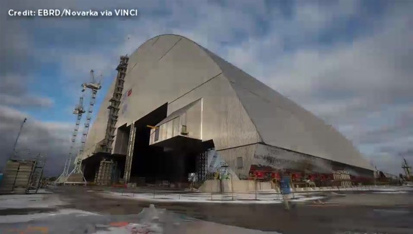 The new shelter is 843 feet wide and 354 feet tall and cost 1.5 billion euros, according to the European Bank for Reconstruction and Development.