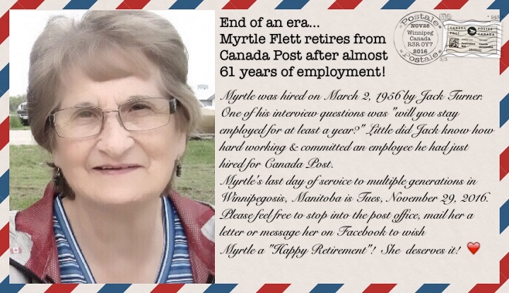 Flett was hired part-time with Canada Post in Winnipegosis on March 2, 1956.