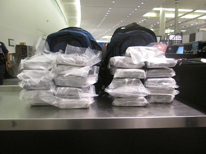 The suitcase was further examined by the officers, who found it contained two backpacks with 21 brick-shaped bundles of suspected cocaine inside.