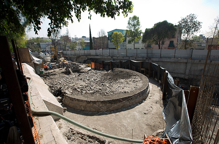 The circular platform, about 36 feet in diameter and four feet tall, now sits in the shadow of a shopping mall under construction. The site is believed to have been built to worship the god of wind, Ehecatl-Quetzalcoatl, and the plans to preserve it and make it visible to the public with a large viewing window.