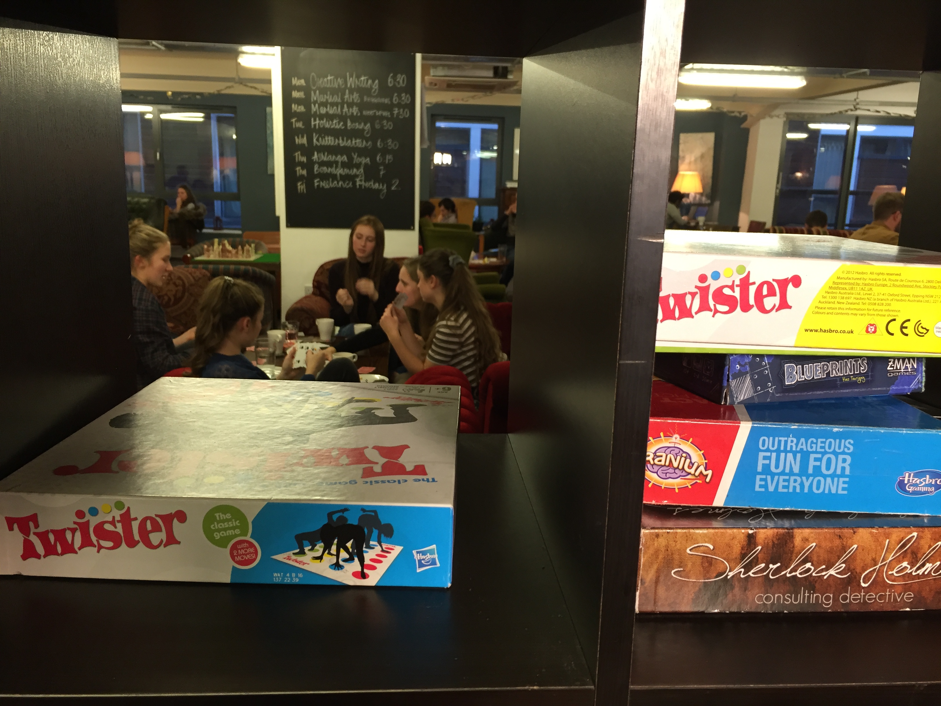 “The fact that you have the free choice makes you not want to ‘take the mick,’ or take the entire jar of biscuits,” says customer Luke Halliwell, while sipping a latte and playing a board game with a friend.