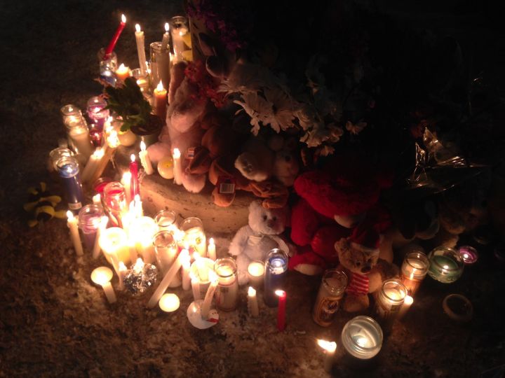 Memorials with candles and stuffed animals were set up at each corner of the intersection.
