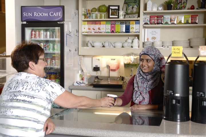 Volunteers offer coffee and cookies to patients with the hostess cart at Edmonton's Cross Cancer Institute on Dec. 19, 2016. Courtesy, Alberta Health Services