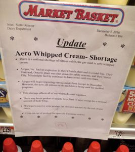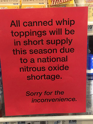 The scarcity of nitrous oxide is due to a fatal accident at an Airgas chemical plant in Florida in August. According to the Airgas website, it’s the largest producer of nitrous gas in North America.