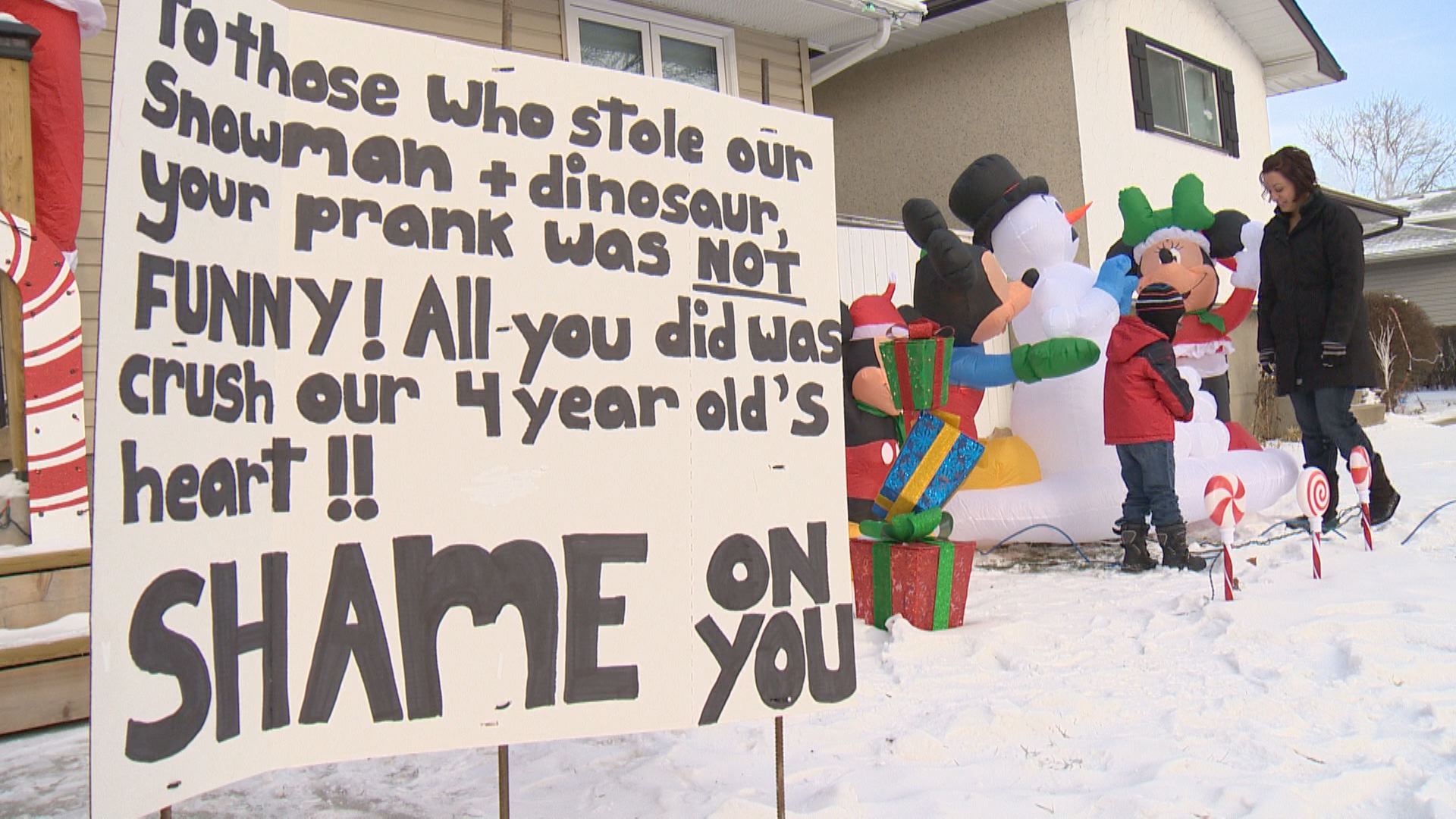“To those who stole our snowman + dinosaur, your prank was not funny! All you did was crush our 4 year old’s heart!! Shame on you.”