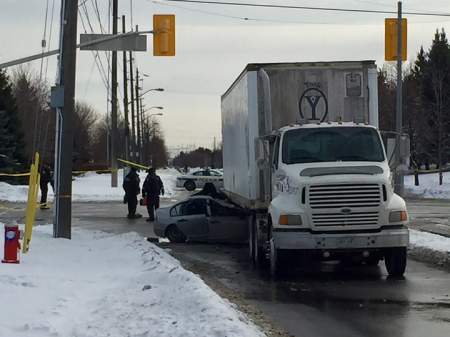 A female driver was killed following a collision between a transport truck and a car in Brampton Friday morning.